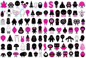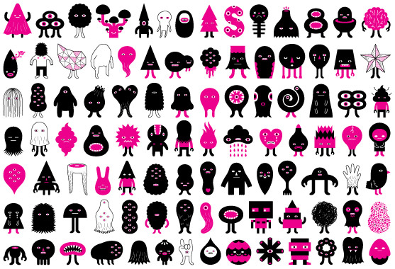 Brazilian Illustrator Guilherme Marconi makes use of multiple vector graphics and illustrations to completely cover an entire canvas area resulting in an eye-catching, detailed and fantastic piece of design. With limited colors and varied line weights on each individual image the overall design gives a great chaotic pattern effect with scattered highlights of color appearing throughout. A slightly larger image is often placed to provide a focal point to draw in the eye.