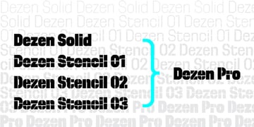 Dezen Pro is a contemporary, mechanical grotesque typeface. Its letters were first constructed from individual modules and then optically refined to enhance it's rhythm. The tight letter spacing and narrow proportions make this typeface great for headlines. The family consists of 8 fonts and will cost you $419.95 USD, or you can buy them separately for $69.95 USD each. The regular version of Dezen Pro is free.