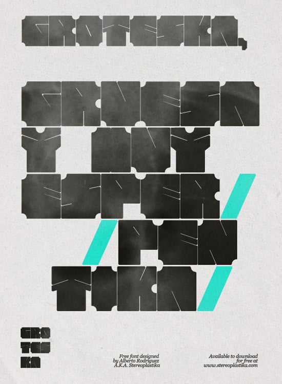 Groteska is an extreme experimental typeface, suitable for some headlines and even more likely to be used in digital artwork and photo-manipulations.