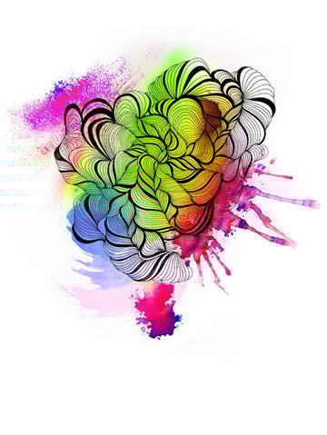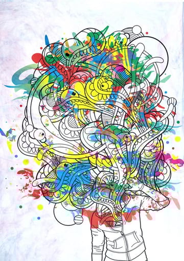 Head Explosion is another piece whose primary shapes are simply black lines on a white background. This piece, however, is brought to life using cleaner and smoother colored shapes rather than the strong textured images that were using in Line Emotions. A subtle texture in the background is also used, bringing out the best of the colors used in the main illustration.