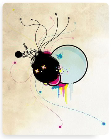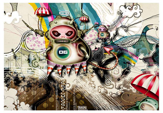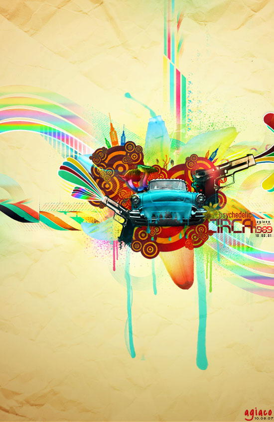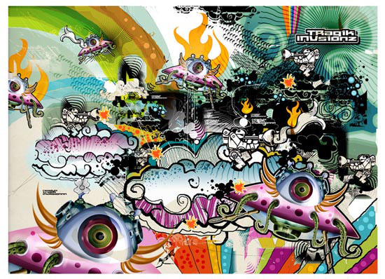Like a piece featured earlier in this showcase (Psychedelic Bomb), this piece combines modern day trends such as vector shapes, drips, sprays and textured images with a psychedelic style color scheme.