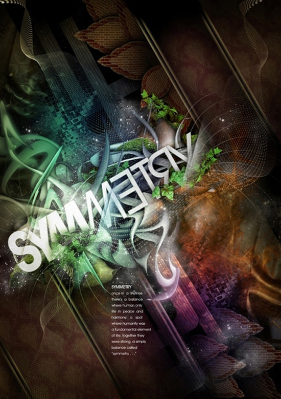 Symmetry uses three-dimensional shapes and simple fractal backgrounds in the background of the piece merged with some strong colors and textured images to create a unique piece. The typography is cleverly mirrored; although back to front, it is extremely easy to read.