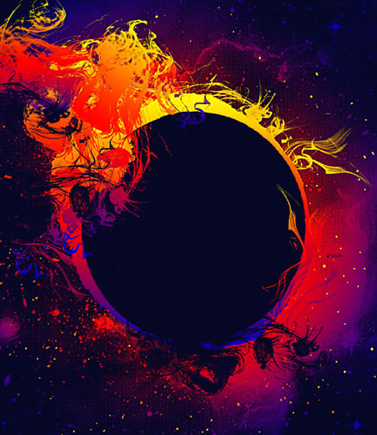 Black Hole Sun is a t-shirt design (click through link to see t-shirt). It combines clean-cut shapes, splashes, bright colors and subtle textures to create a very visually appealing piece that can have us mesmerised in seconds.