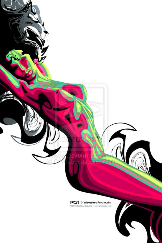 This psychedelic vector piece of artwork uses quite a minimal color palette but manages to pull of the psychedelic look very well, using certain colors for shadows and others for highlights.
