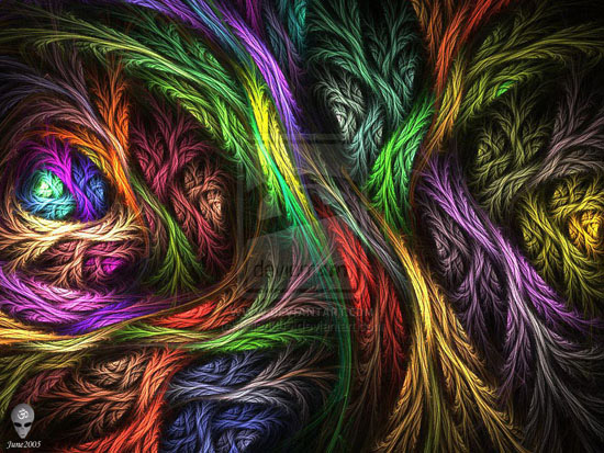 This fractal piece titled Most Beautiful Fractal us almost hair like, combining hundreds of thin stroked lines to form a swirly and colorful unique piece.