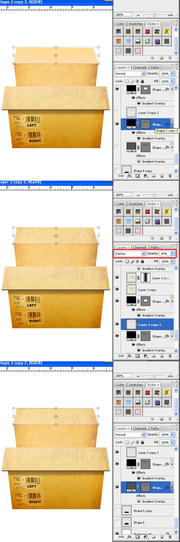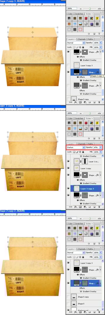Now we are going to add some dirt to the box cover. Refer to 'step 3' for this. But change the Blending Mode to Darken and set the Opacity to 57%.