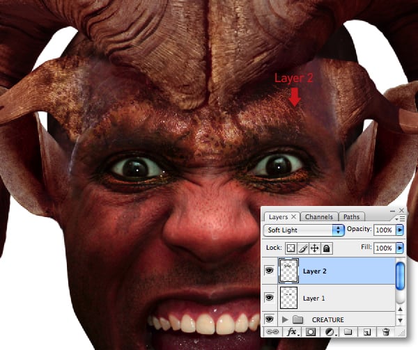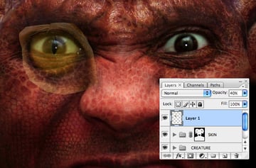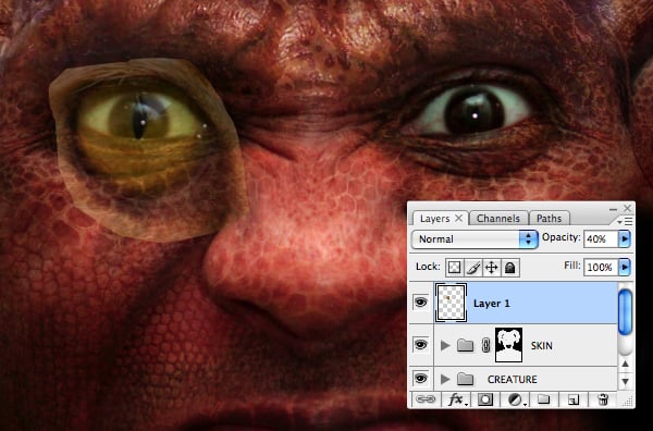Paste the selection around the creature’s lower left cheek, erase the hard edges, then set its Blend Mode to Soft Light. Transform/Warp, then use the same technique as you did with the crocodile skin (Step 19) to remove overlapping areas.