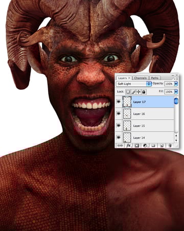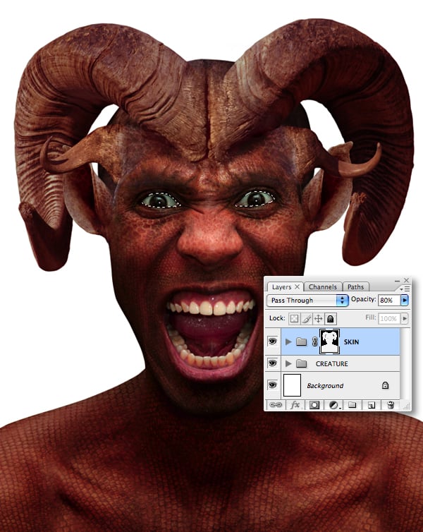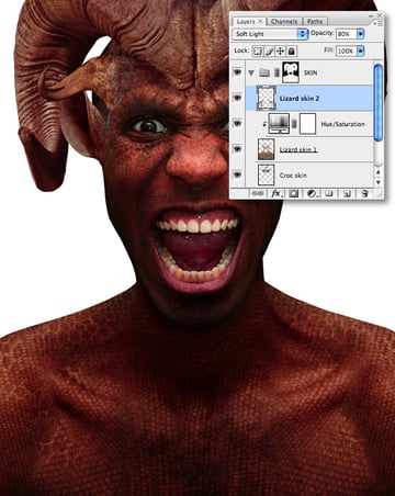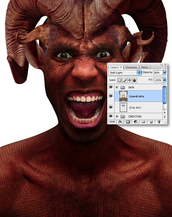 At this point feel free to add more skin layers; I added some larger scales (sourced from the iguana’s lower jaw) and placed them over the creature’s torso with a Blend Mode of Soft Light at 80% Opacity.