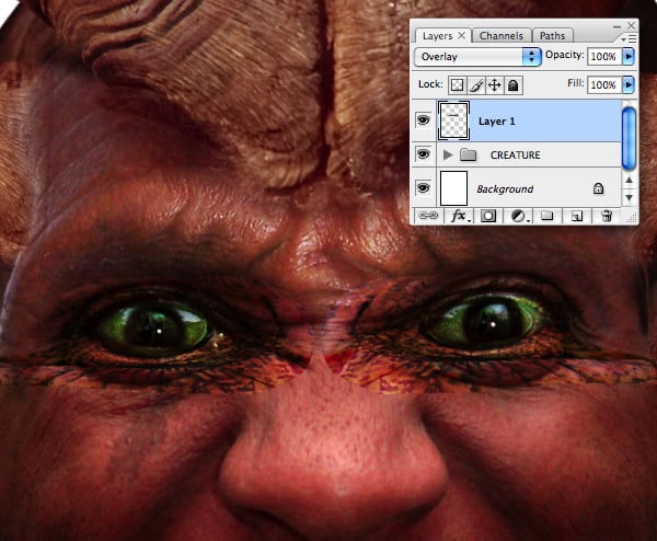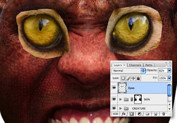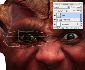 Paste the selection as a new layer above the “CREATURE" folder, move it into position and resize/squash (changing the Blend Mode to Overlay will help positioning). Now use the Transform > Warp function to pull it into shape. We’ll eventually be using a different eyeball, so just concentrate on getting the eyelids to match.