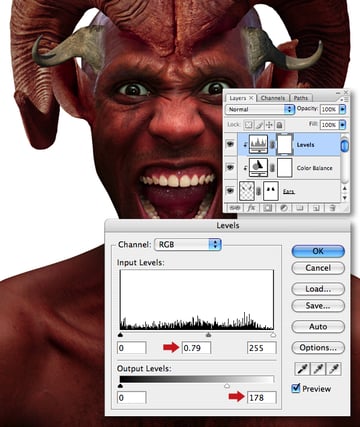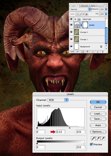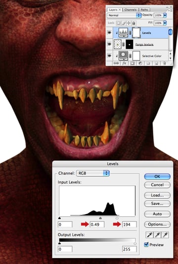 The teeth are now begining to blend with the rest of the image, but still need a little more work. Clip a Levels adjustment to the “Fangs texture" layer and set the Input Levels.