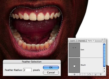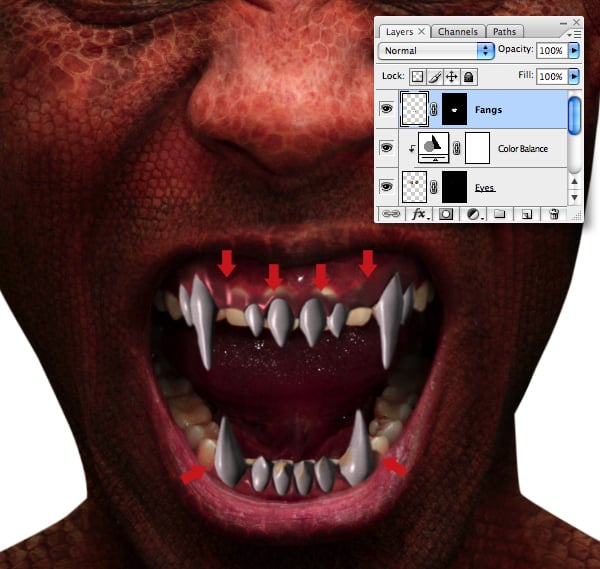 Load a selection from “Alpha 3" (the mouth), target the “Fangs" layer and select Layer > Layer Mask > Reveal Selection. Now grab a small, soft-edged brush and modify the mask by hiding the areas as indicated. Don’t worry about revealing parts of the original teeth, as you’ll fix this later.