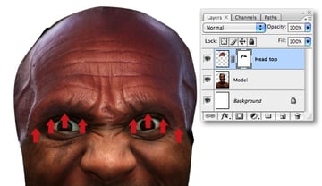 Paste the selection as a new layer in your working file, then resize and label it “Head top." Add a layer mask, grab the Brush Tool (B) and blend the eyebrows into the underlying layer using a black, soft-edged brush.