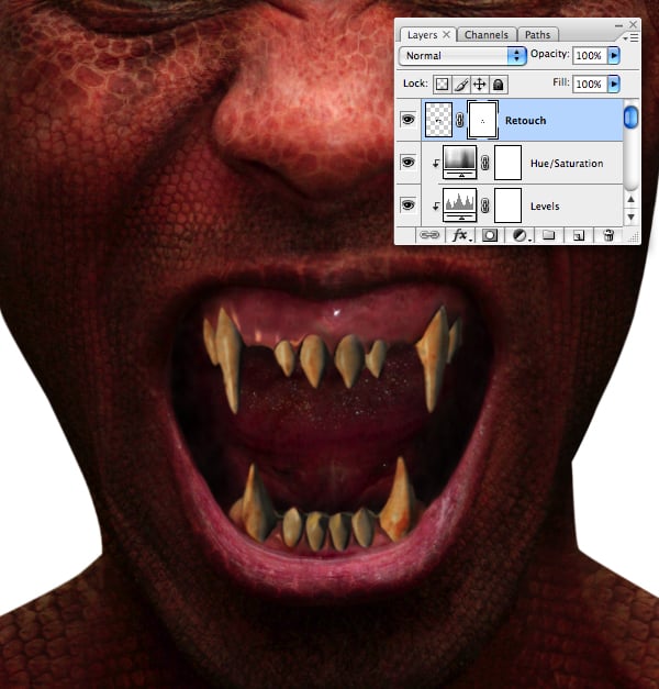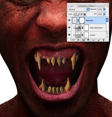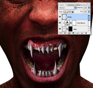 Add a mask and hide any retouch overlaps by painting within a selection from your “Fangs" layer.