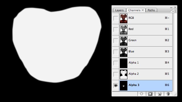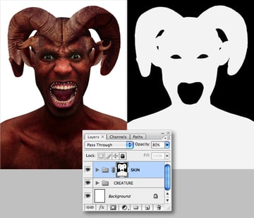 Generate a selection from the new channel, then target the top RGB composite channel. Switch back to the Layers tab and with the “SKIN" folder highlighted choose Layer > Layer Mask > Reveal Selection. Next, load a selection from “Alpha 1" (the eyes) and also fill with black – just in case any textures were mistakenly placed here.