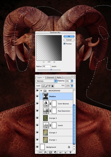 To add some dimension we’ll cast a shadow from the creature. Add a new layer and name it “Shadow." Generate a selection from “Alpha 2" and fill with black, then set the Blend Mode to Multiply and add a Gaussian Blur of 45 px. Now use the Transform’s Distort function to pull the layer content down and right. (I’ve made a selection from the shadow for clarity in the screenshot). You can now organize these layers by placing them within a group folder called “BACKGROUND."