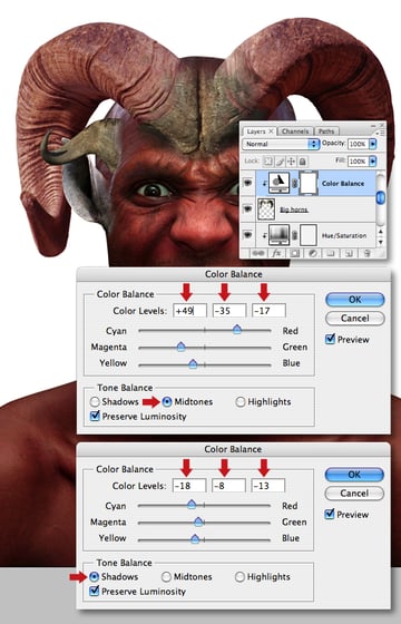 Clip a Color Balance adjustment to the “Big horns" layer, then set the Midtone and the Shadow sliders as shown.