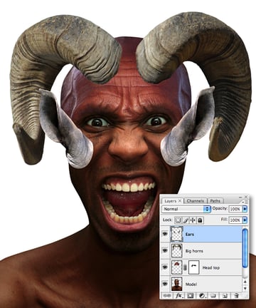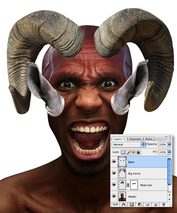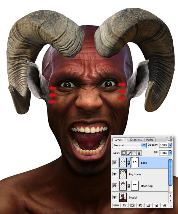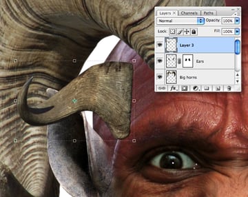 Paste as a new layer, then resize, rotate and position to the left. Duplicate the layer, then Flip Horizontal for the right ear. Human ears generally align with the eyes, but as this creature is a hybrid, we’ll position them higher to overlap the horns. When you’re happy with their positioning, target the upper layer and hit Command + E to Merge Down. Name the resulting layer “Ears."
