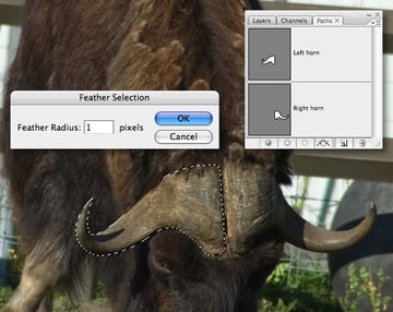 Open the ox image, then isolate each horn on a separate path. Load the left horn as a selection, Feather and Copy.