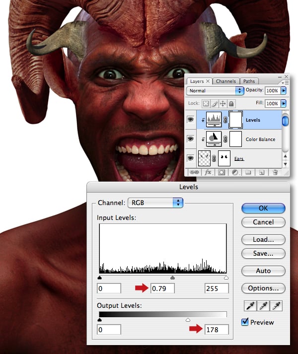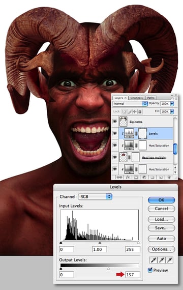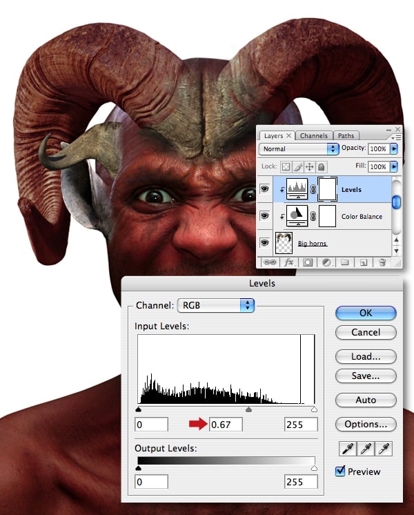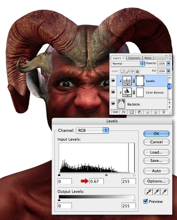 We now need to add another adjustment layer to the “Big horns" layer. First, target the Color Balance adjustment layer thumbnail, then clip a Levels adjustment to it and set the midpoint Input slider to 0.67.
