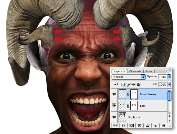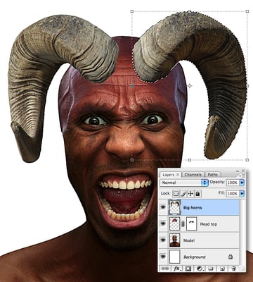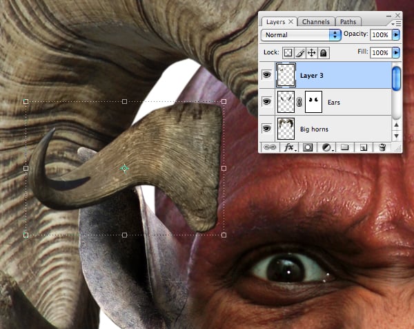 Paste as a new layer and name it “Big horns." Resize and Transform by rotating over the forehead. Now drag a rectangular selection using the Marquee Tool (M) to cover the right hand horn. Next, select the Move Tool (M) and use the arrows on your keyboard to nudge right to increase the space between them.
