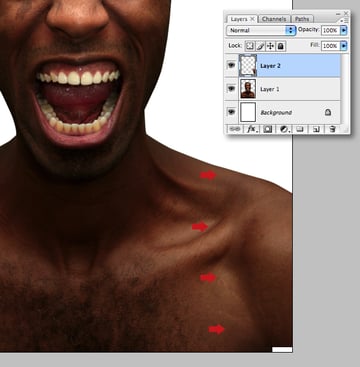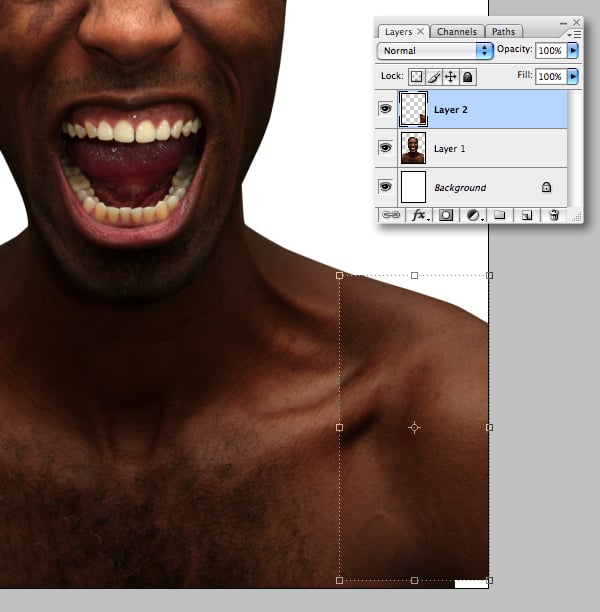Make a rectangular selection from the left shoulder, then hit Command + J to float as a new layer. Go to Edit > Transform > Flip Horizontal and position as shown. Ignore the small white space at the bottom, we’ll clone that later.