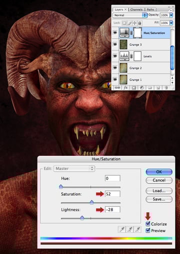 Shift-drag “Texture_2.jpg"" (also from the “source" folder) above the adjustment layer and name it “Grunge 3." Next, add a Hue/Saturation adjustment, check Colorize and use the Saturation and Lightness settings below.