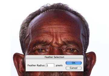 Open the elderly man image, then draw a fairly loose path to encompass the eyebrows and forehead. Create a path-based selection, Feather by 1 px and Copy.