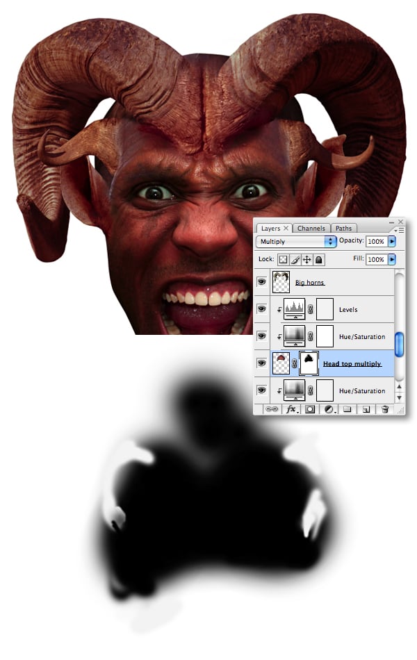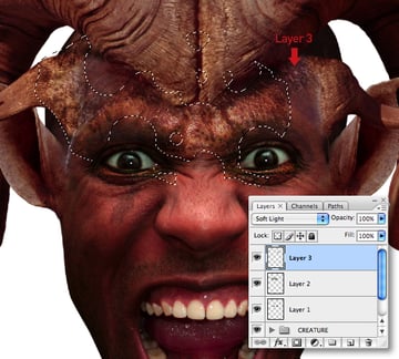Now we’ll add some shadows to the creature. Add a new layer at the top of the stack, set it’s Blend Mode to Multiply and label it “Shadows." Load a selection from “Alpha 2" and paint your shadows using a variety of black, soft-edged brushes at various opacities. It’s important to use the existing image lighting as a guide. You can also paint within selections from the “Big horns," “Small horns" and “Ears" layers.