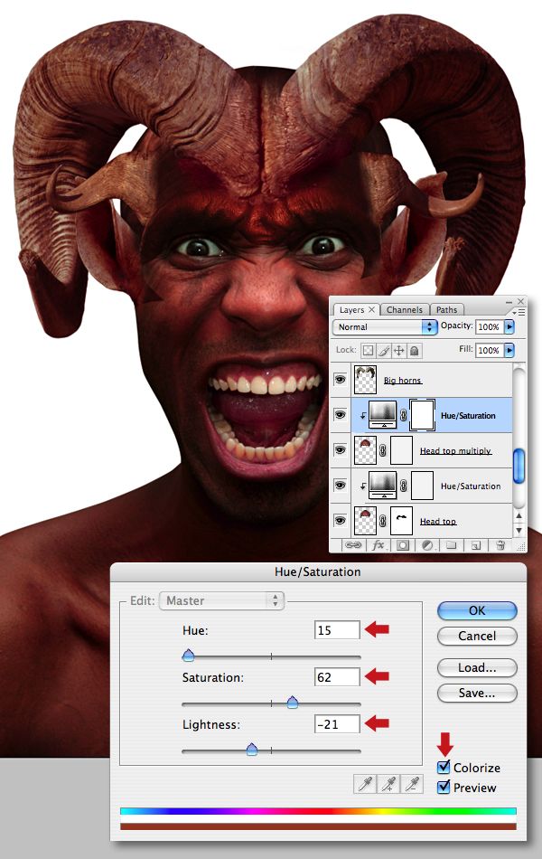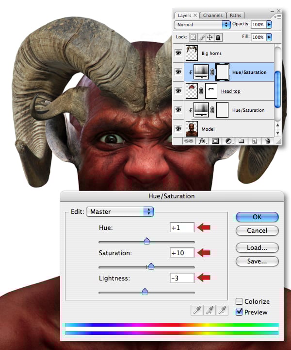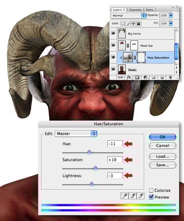 Use the same technique to clip a Hue/Saturation adjustment to the “Head top" layer using the settings below.