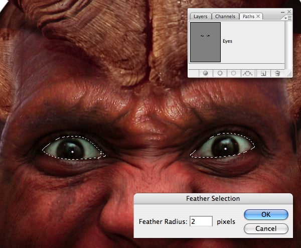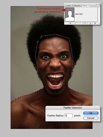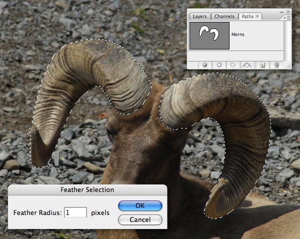 When you’re done Command-click your path thumbnail to generate a selection. Next, hit Option + Command + D and enter a Feather Radius of 1 px and Copy to the clipboard.