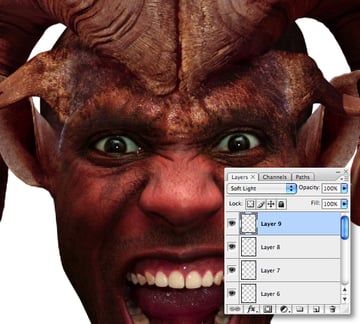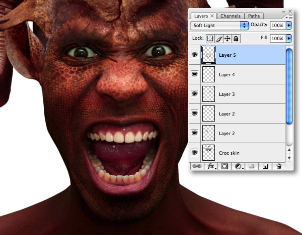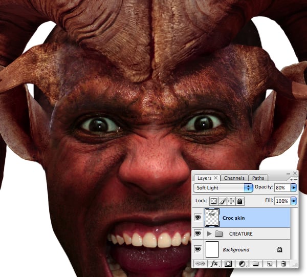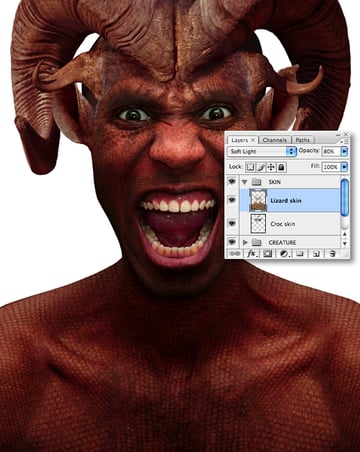 When you’re done, target the uppermost layer and Merge Down each layer in turn, including the first skin layer that was added around the eyes. This composite layer should automatically be set to Soft Light. Name the merged layer “Croc skin" and lower its Opacity to 80%.