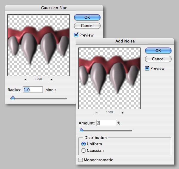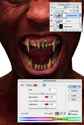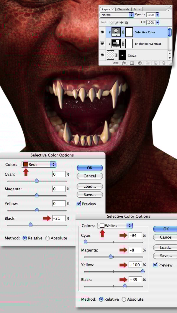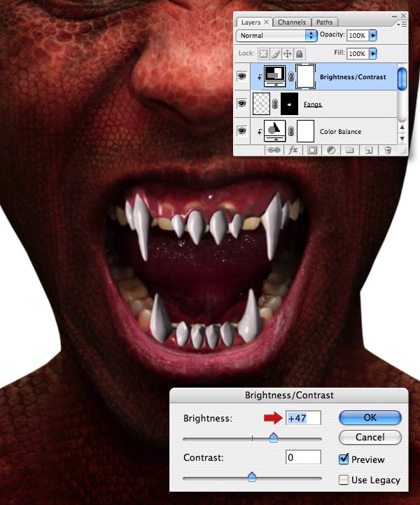 Now clip a Brightness/Contrast adjustment the “Fangs" layer and increase the overall Brightness setting.