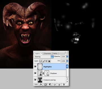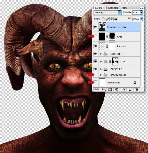 Disable the visibility of the “Background" and “Grad" layer, as well as the “BACKGROUND" folder. Drop an empty layer at the top of the stack and choose Image > Apply Image, then hit OK in the next window. You’ll now have a composite of just the creature. Hit Shift + Command + U to desaturate, then set its Blend Mode to Overlay and Opacity to 65%. Finally, name the layer “Creature overlay."