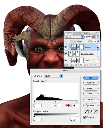 Now clip another Levels adjustment, this time to the “Big horns centre" layer and set the whitepoint Input slider to 248.