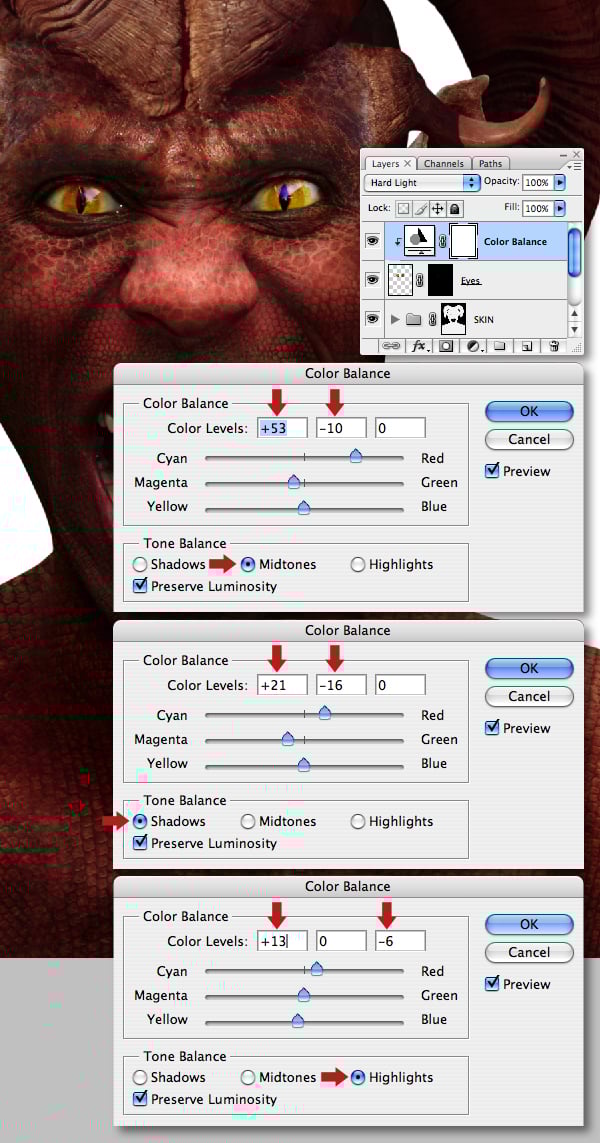 Clip a Color Balance adjustment to the “Eyes" and use the settings below to make them more pronounced.