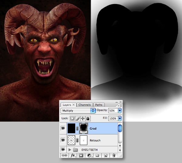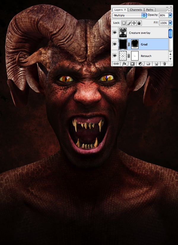 The background is now complete, so next we’ll concentrate on the lighting. Add a layer at the top of the stack, fill it’s entire content with black and label it “Grad". Change the Blend Mode to Multiply and drop the Opacity to 50%. Add a mask, select black as your Foreground color, then grab the Gradient Tool (G) and choose the Foreground to Transparent preset. Now Shift-drag a Radial Gradient from the creature’s nose down to the bottom of the canvas.