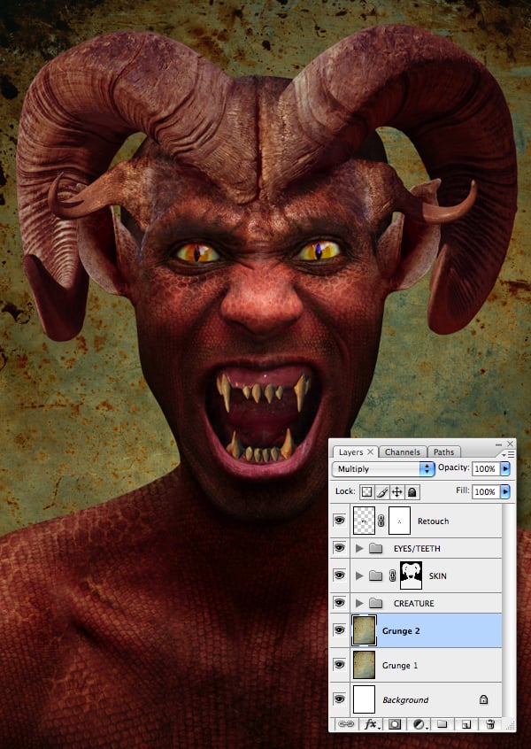 We’re almost done, but first place all your loose layers into a group folder called “ADJUSTMENTS." Now sit back and scrutinize your work and carry out any final adjustments. I decided the creature was a little too dark, so I reduced the Opacity of the “Creature overlay" layer to 30%. Finally, I reinstated some background detail around the right side if the creature’s head with a mask on the “Grunge 2" layer.