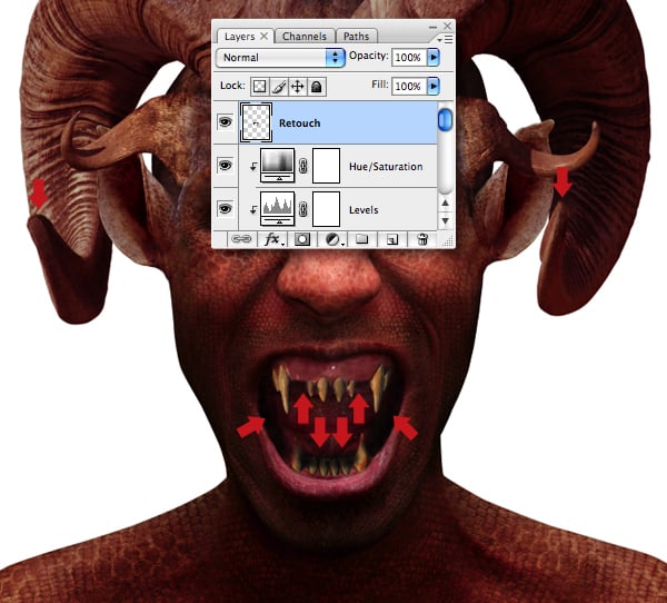 Add a layer at the top of the stack and label it “Retouch." Set the Clone Tool (S) to Current & Below and also to sample adjustment layers. Now generate a selection from “Alpha 3" and clone over the original teeth. Don’t worry if you’re cloning overlaps the 3D teeth, we’ll sort that next. Also, repair the damage on the tips of the large horns by cloning within a selection from “Alpha 2."