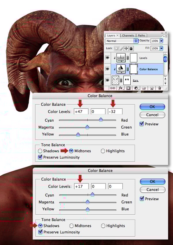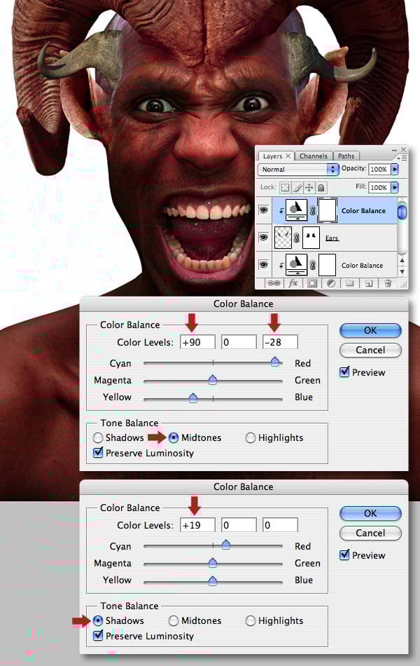 I also tweaked the Color Balance of the “Ears." Remember, adjustment layers are non-destructive and can be altered at any point during the image creation process.