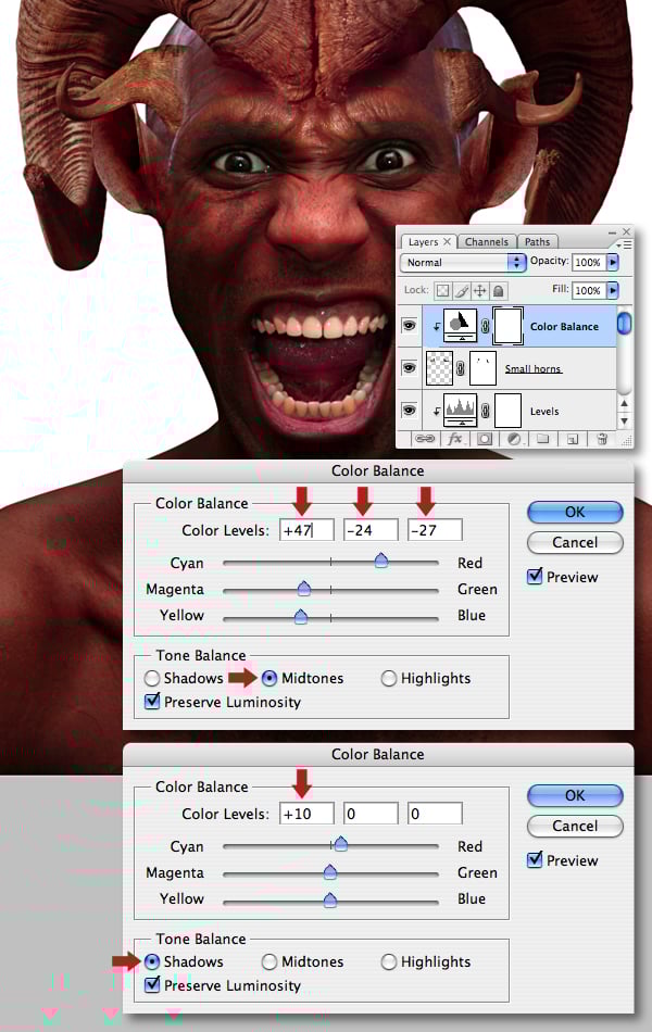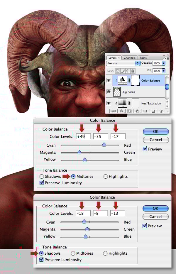 Clip a Color Balance adjustment to the “Small horns" layer and set the Midtone and the Shadow sliders as below.
