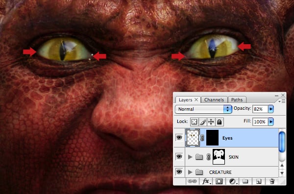 Paste at the top of the layer stack, then set the Blend Mode to Soft Light and erase the hard edges. Now position under the creature’s left eye and Transform/Warp to fit.