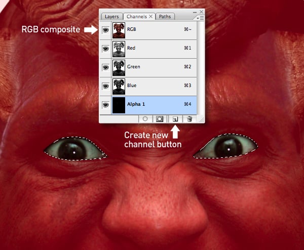 Generate a selection from “Alpha 1" (the eyes), then go to Layer > Layer Mask > Reveal Selection. Now use a small, soft-edged brush at a low Opacity to reinstate the corners of the original eyes as indicated.
