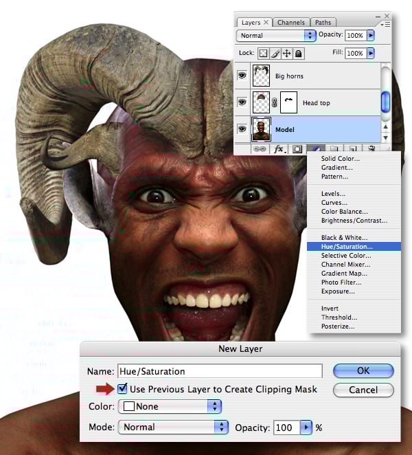 Target the “Model" layer and press Option while selecting Hue/Saturation from the Create New Fill or Adjustment layer menu. In the next window, check the Use Previous Layer to Create Clipping Mask option and hit OK.