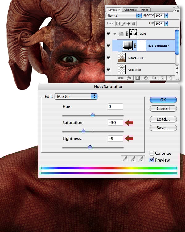With the texturing of the creature’s skin complete, scrutinize the image and apply any adjustments – I felt the scales needed a tweak, so I clipped a Hue/Saturation adjustment to the “Lizard skin" layer.