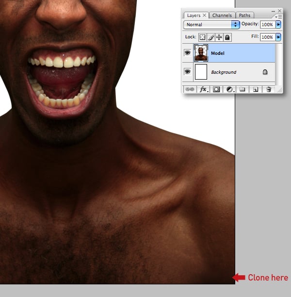 Set the Clone Tool (S) to Current Layer and use a medium, soft-edged brush to fill the white gap at the bottom. Now name the layer “Model."