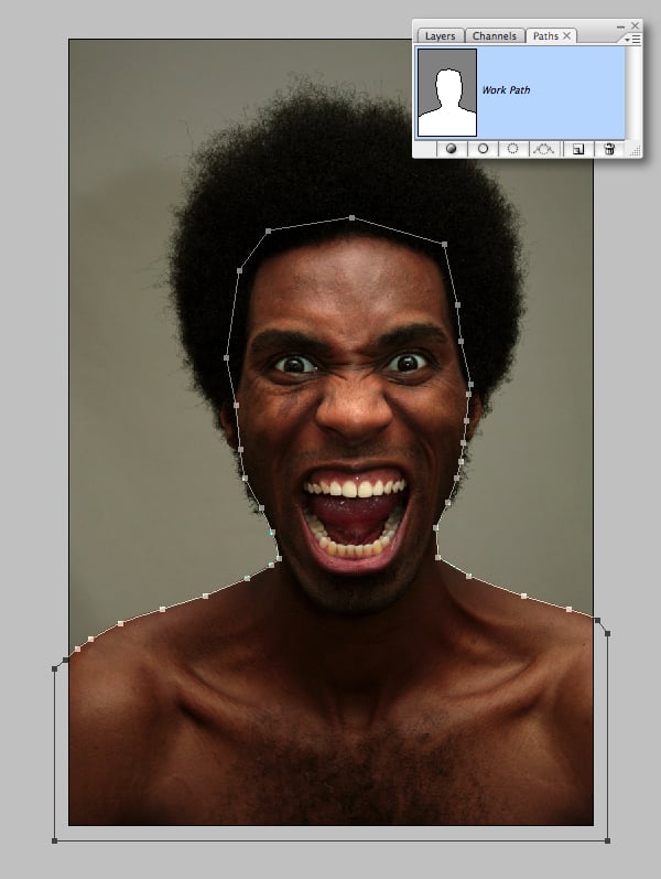 Open the model image. Set the Pen Tool (P) to Paths and draw a closed path around the model’s head and shoulders, excluding the hair.