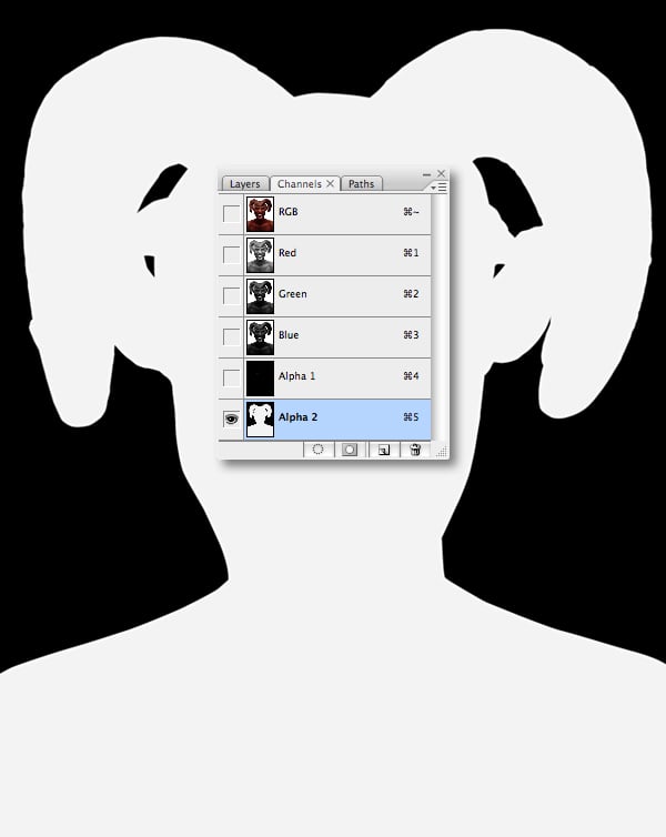 First, generate a layer-based selection from the “Model" layer, then switch to your Channels tab. Add a new channel and fill the active selection with white. Now fill further areas with white using selections from the “Head top," “Big horns," “Ears" and “Small horns" layers.
