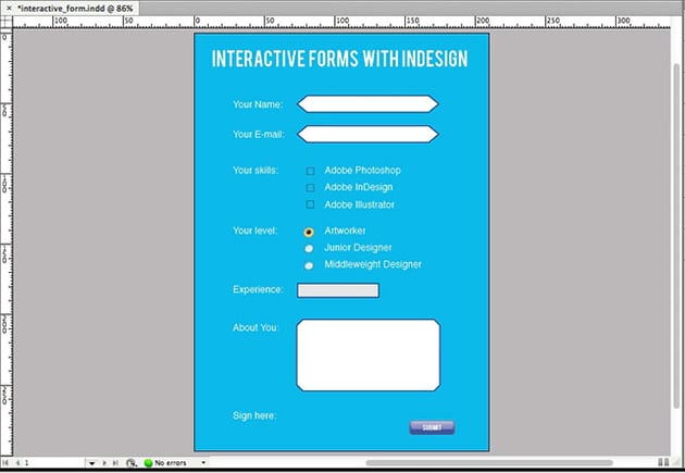 Another great new feature in Adobe InDesign CS6 the possibility to create fully interactive forms without using Acrobat or any other additional applications. You can create the design and the interactive elements like combo boxes, radio buttons, checkboxes, signature fields, text boxes and buttons using InDesign CS6.