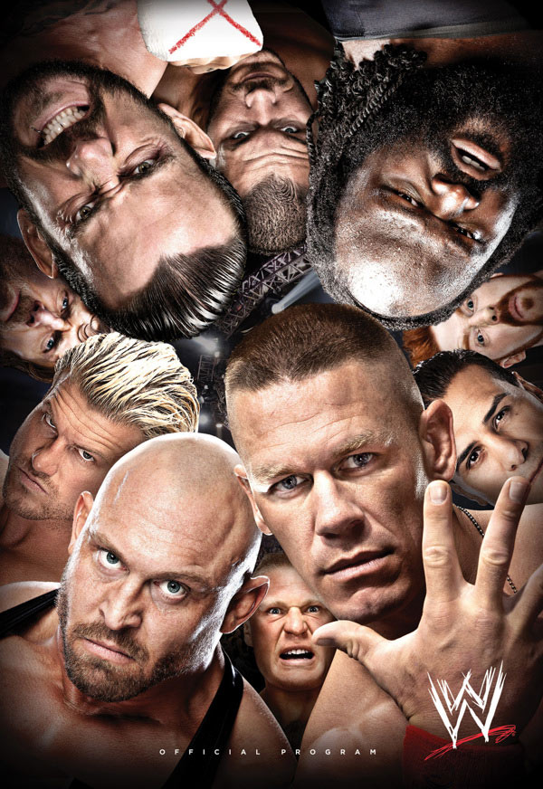 As for the Venue Program, I inherited the responsibility as the Art Director and it is probably the most challenging project I have done. Just coming up with the cover took close to a month, and once you have an approved cover you need to figure out the pagination and come up with a look to carry throughout the entire 70+ page program. A lot of the previous versions were templates and my goal was to do something different. I wanted to put my own mark on it and show the fans what it’s like on the other side. Most people only see these larger than life characters in the ring when they are battling it out, but you never really see them backstage, or on the road where they spend the majority of their days. The life of a professional wrestler is extremely demanding and they really don’t have an off-season like most other sports. With this Venue Program I had the chance to give the fans a book that I would have liked to see myself. You finally get to see what it’s like behind the curtain.