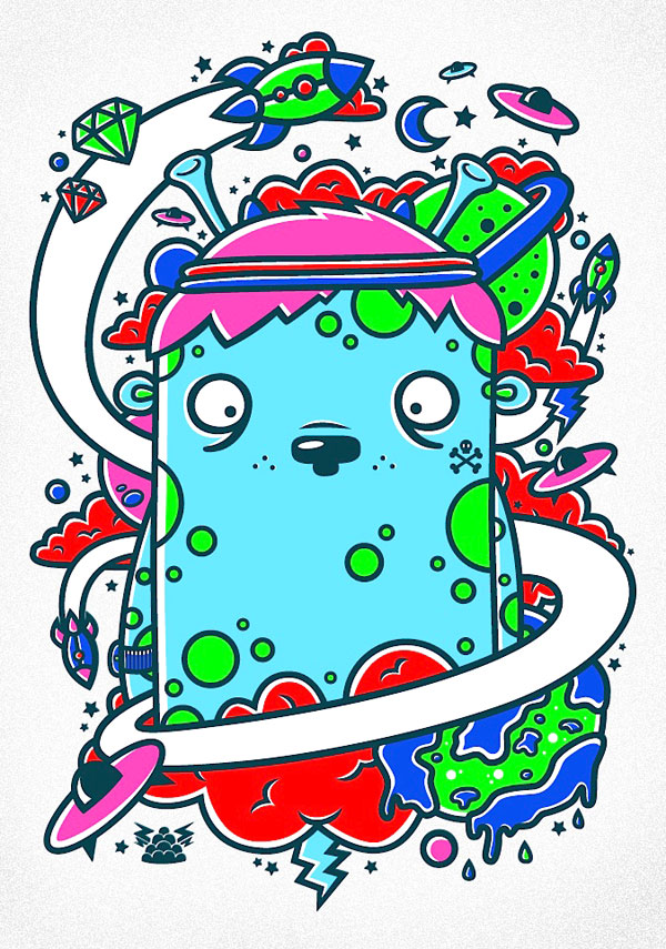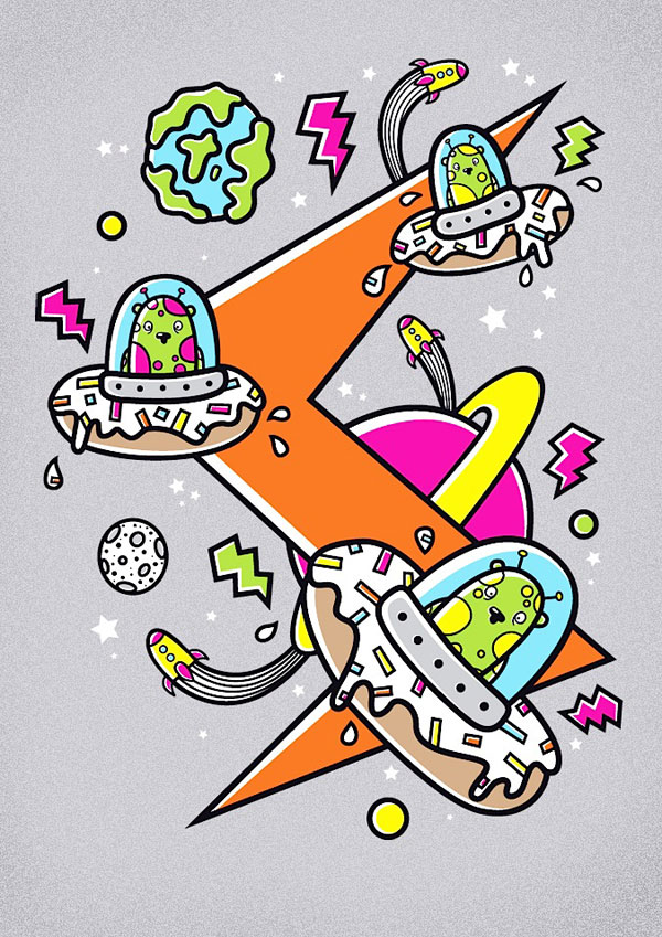 My favorite piece I have created so far has to be the alien shirt design I did for the clothing label, Sourjelly. I got to exercise a really bold and psychedelic color palette which, I normally wouldn't risk using but I think it turned out really best for the subject matter illustrated. I think it's a well-rounded piece and functions perfectly for the intended medium. As mentioned before I have quite an obsession for anything Buzz Lightyear so I love to illustrate things related to a 'Space' theme. I wanted to illustrate an alien with various space paraphernalia around him. I used the rocket's flight paths to pull the whole design together and give it that essential strong composition. I also generally love creating t-shirt designs as you get to express yourself through just wearing the design, much like tattoo design which, I also have great passion for. As for the future, I have many dreams and ambitions I hope to achieve. I want to explore a more traditional side to my style but not phase out the vector of course. I also want to start producing more self-initiated projects as well as the collective I mentioned earlier. Essentially I just want to progress as Superfex, produce more work and show my versatility across the design spectrum.
